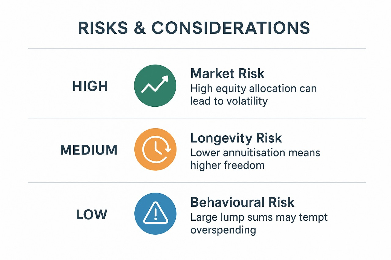 Longevity Risk: Lower annuitisation means higher freedom but also risk of outliving savings.